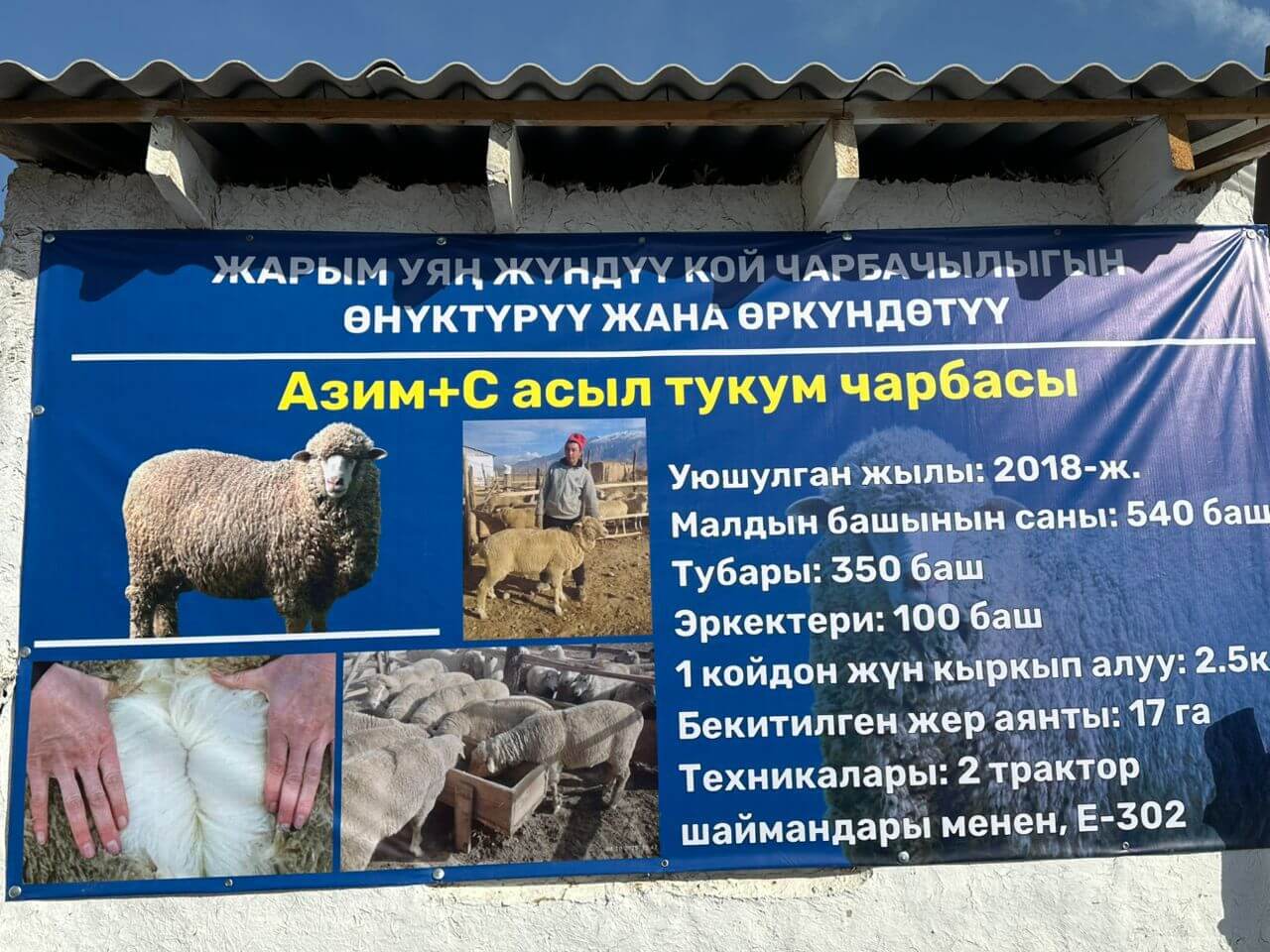 Аталган чарбанын жарымы уяң жүндүү койлордон турат. Ал эми чарбанын материалдык базасын чыңдоо максатында мамлекеттик фонддон 17 гектар жер бөлүнгөн.